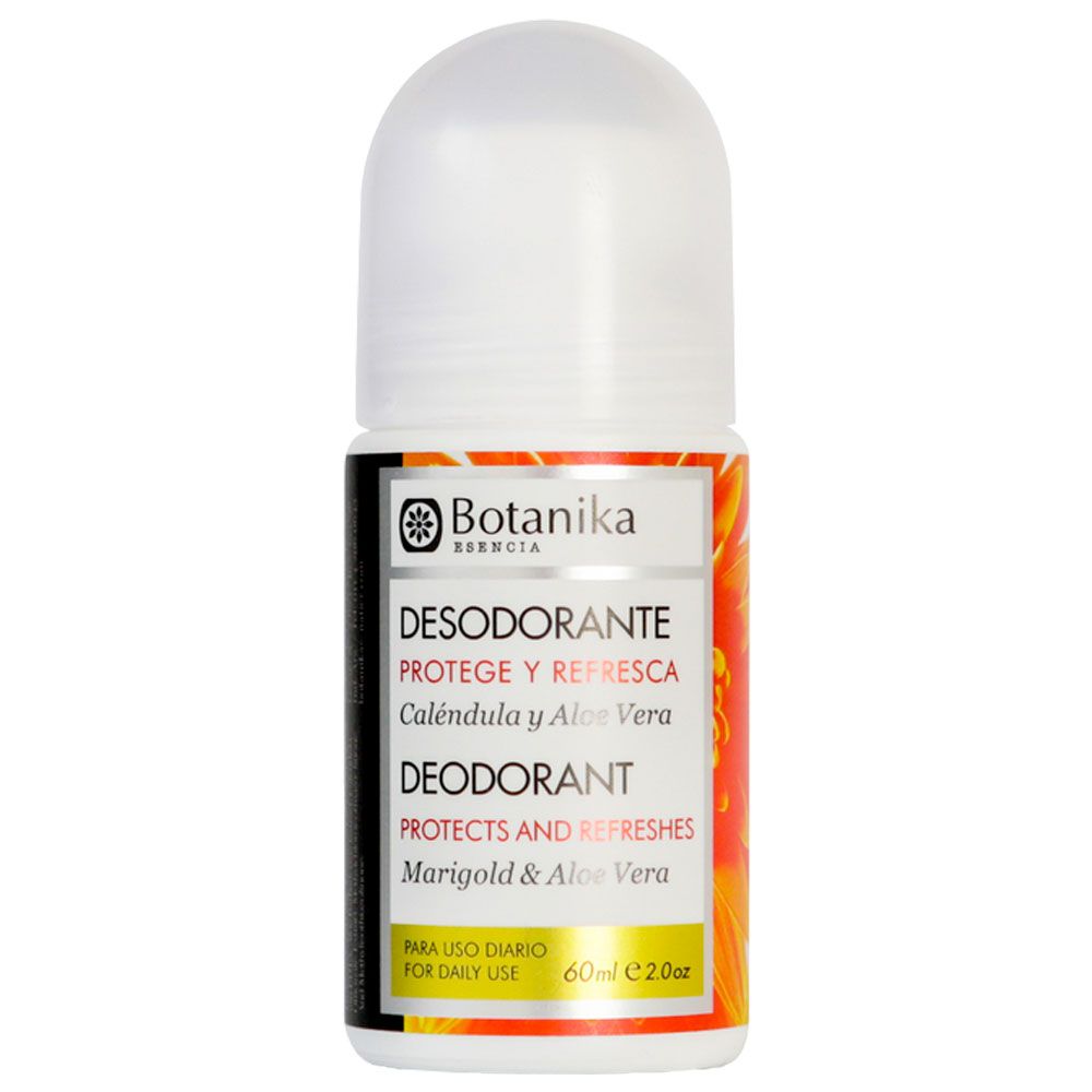 Desodorante roll-on Caléndula y Aloe 60cc Botanika, previene olores y calma la piel irritada con ingredientes naturales.