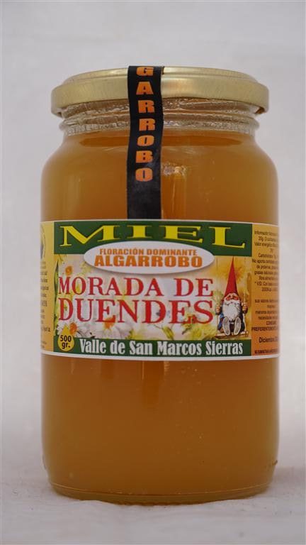 MIEL PURA DE ALGARROBO MORADA DE DUENDES 500 cc, miel natural y saludable para consumo diario y repostería artesanal.